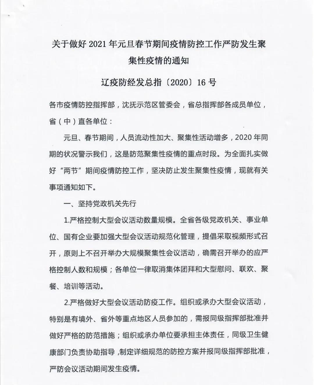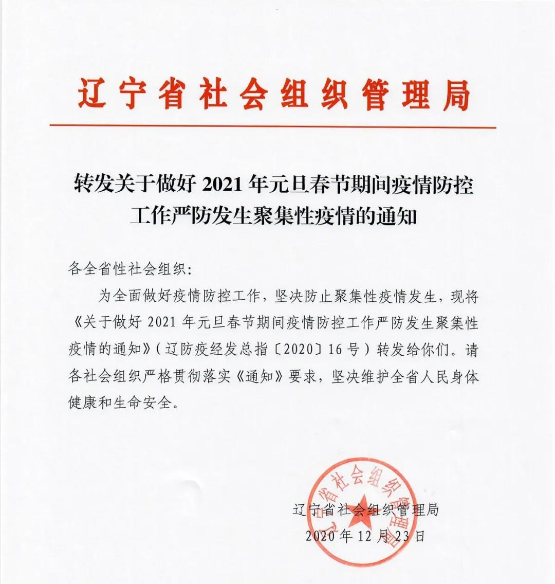 为全面做好疫情防控工作,坚决防止聚集性疫情发生,现将辽宁省社会组织管理局下发的《转发关于做好2021年元旦春节期间疫情防控工作严防发生聚集性疫情的通知》转发给你们,望各单位遵照执行。